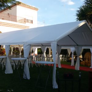 El alquiler incluye la carpa, laterales con ventanas (si lo prefieres), frontales con cremalleras, y cortinas decorativas para realzar el ambiente del evento.