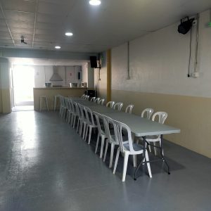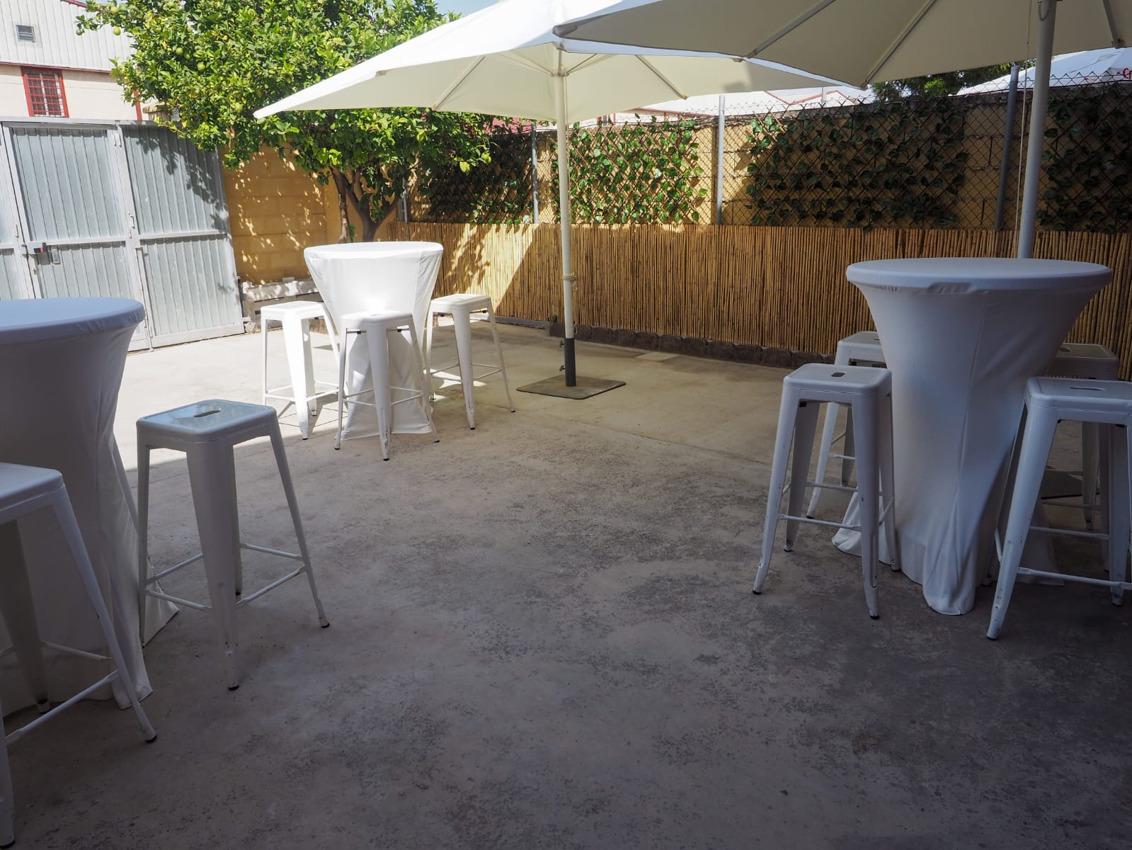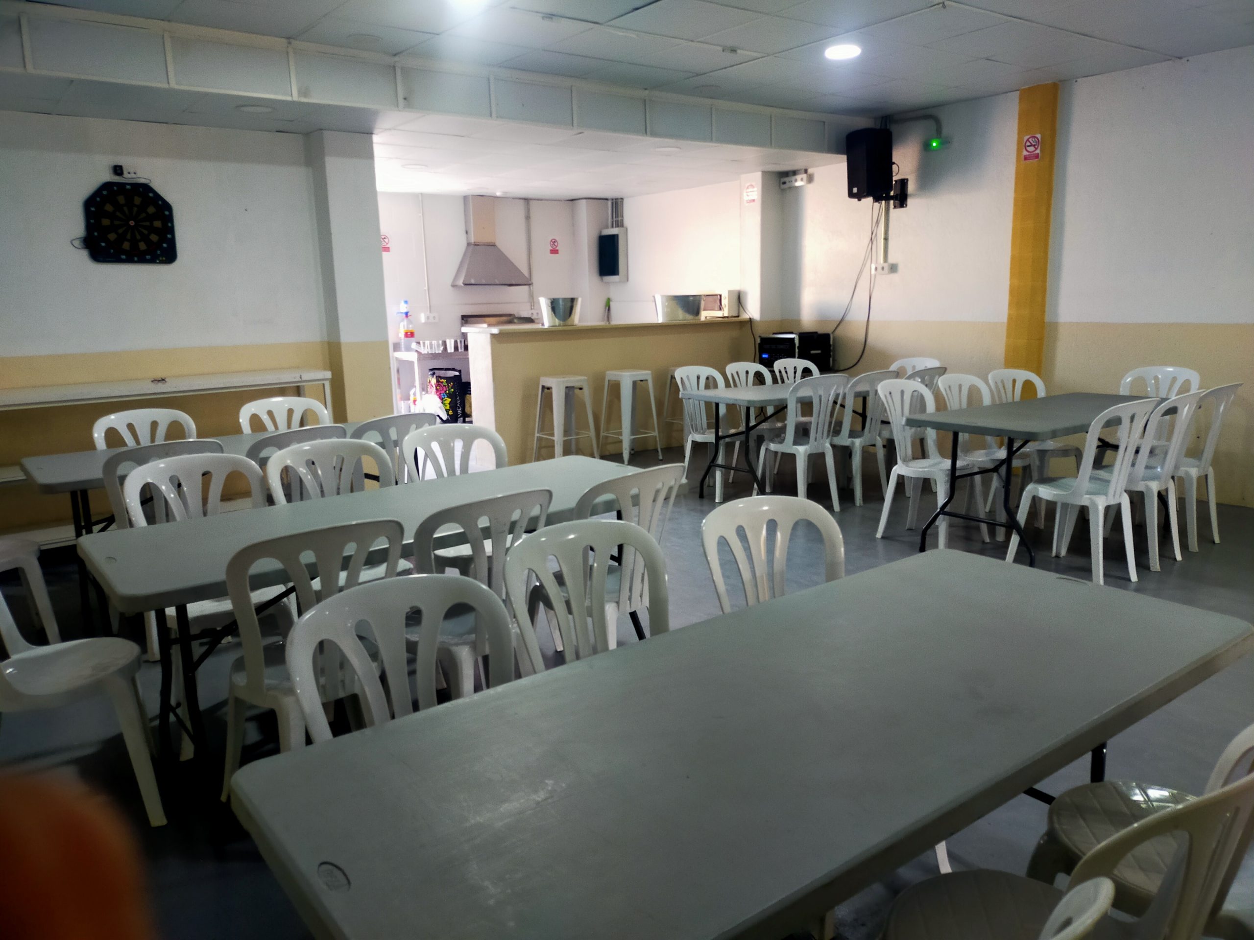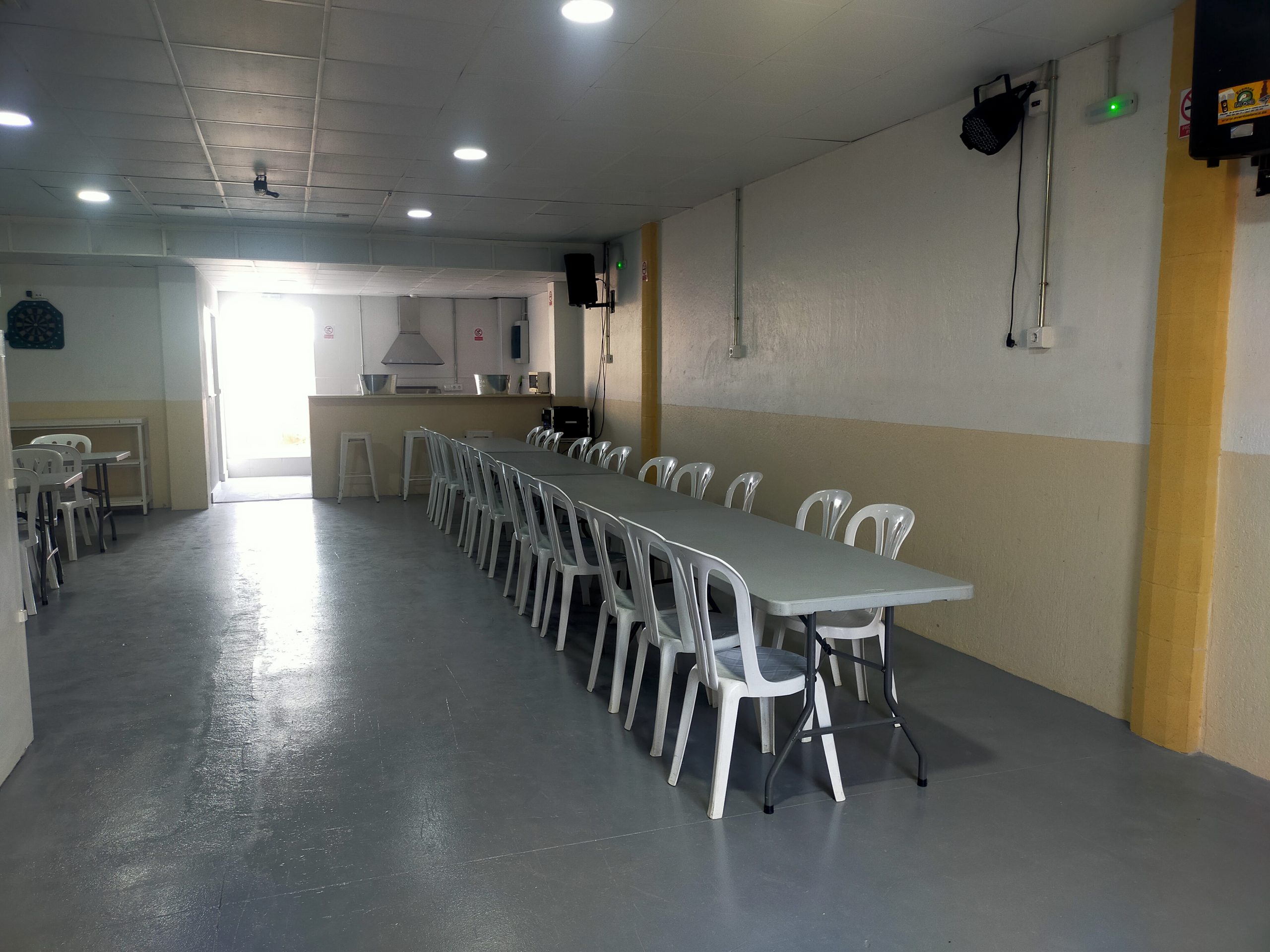 También dispone de 60 sillas y 9 mesas rectangulares a tu disposición. - Patio delantero exterior de 70 m²: un espacio abierto ideal para disfrutar al aire libre. En este espacio podéis poner un hinchable mediano (de 3×6, 4×6, ó 6×6 metros como máximo).
